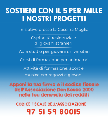 e sostenendo con il 5 x 1000 l’Associazione giovanile di volontariato “Don Bosco 2000 ODV” – codice fiscale 97515980015.